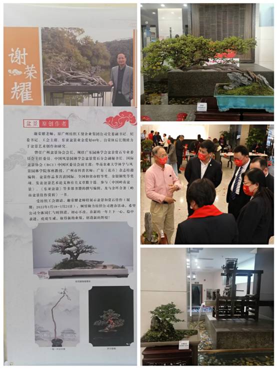 盆景是以植物和山石為基本材料在盆內表現(xiàn)自然景觀的藝術品。為激勵廣大員工“穩(wěn)中求進”穩(wěn)健邁步“十四五”,原廣州紡織工貿(mào)企業(yè)集團公司黨委副書記、紀委書記、工會主席謝榮耀老師(現(xiàn)任廣東園林學會盆景賞石專業(yè)委員會主任委員)受邀公益展示了原創(chuàng)的《不忘初心》、《根深基穩(wěn)一往無前》、“咬定青山”等10個盆景靈石佳作,一枝一葉,一盆一景,妙趣橫生,寓意深刻,勵志鼓舞,吸引廣大員工駐足鑒賞。