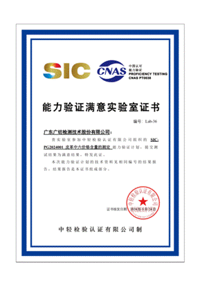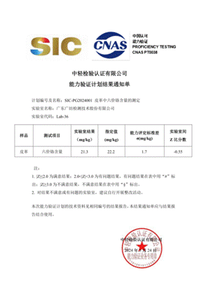 近日,廣紡檢測收到中輕檢驗認證有限公司發(fā)來的SIC-PG2024001皮革中六價鉻含量的測定能力驗證計劃滿意結果通知單和實驗室證書。